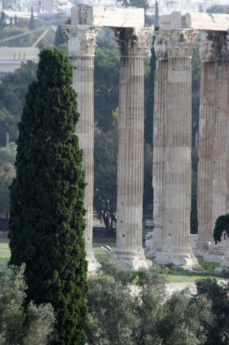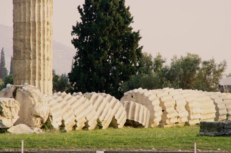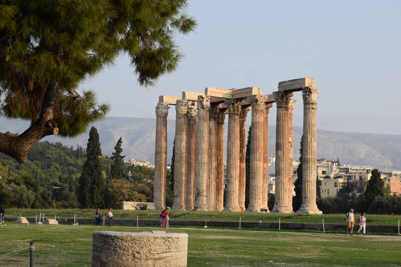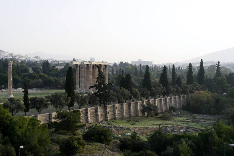 Zo’n 500 meter ten zuidoosten van de Akropolis staat de Tempel van de Olympische Zeus, die ook wel bekend staat als het Olympeion. Er is eeuwenlang aan deze tempel gewerkt. Pas in de 2e eeuw werd de tempel voltooid onder de Romeinse keizer Hadrianus, die een groot bewonderaar was van de Griekse cultuur. Het was toen de grootste tempel in Griekenland: 96 meter lang, 40 meter breed en met 104 Corinthische kolommen van 17 meter hoog. Van deze zuilen zijn er slechts 15 over, de 16e viel om tijdens een storm in 1852 en ligt nog steeds in brokstukken op de grond.