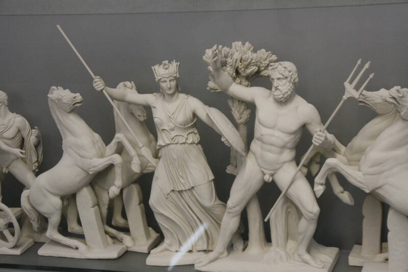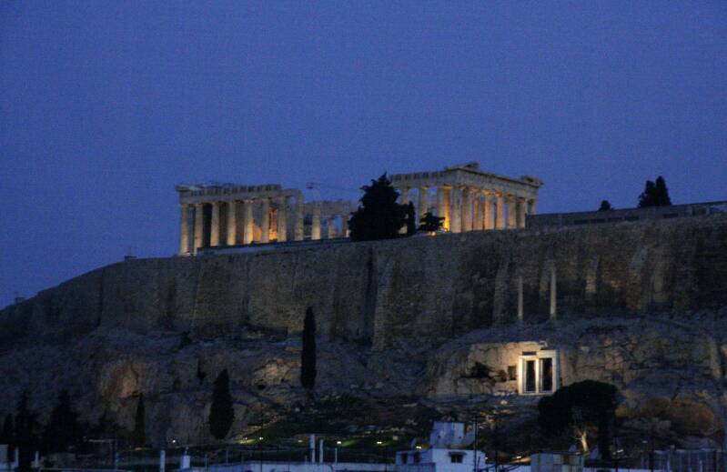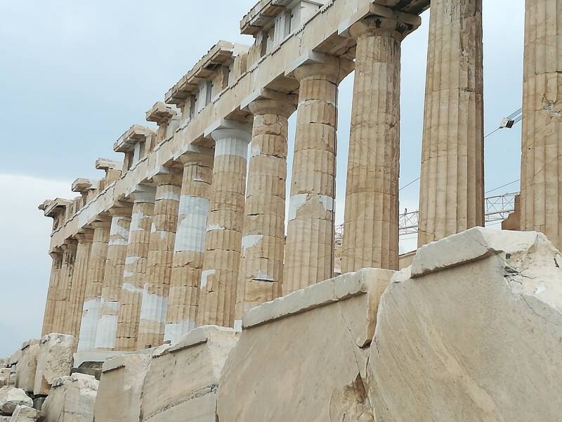 Akro betekent ‘hoog’ en ‘polis’ betekent ‘stad’, de Akropolis is dus een hoge stad en dat klopt want vanuit vrijwel heel Athene is deze afgeplatte berg te zien. Op de top staat trots het Parthenon, gewijd aan de godin Athene (Parthenon komt van Athena Parthenos, de Maagd Athene). Deze tempel werd tussen 447 en 438 v. Chr. gebouwd in opdracht van Pericles, nadat een eerder exemplaar door de Perzen was verwoest.