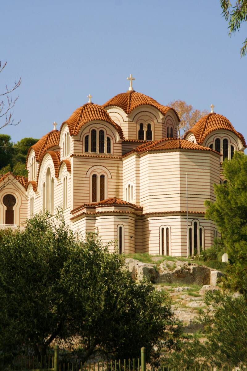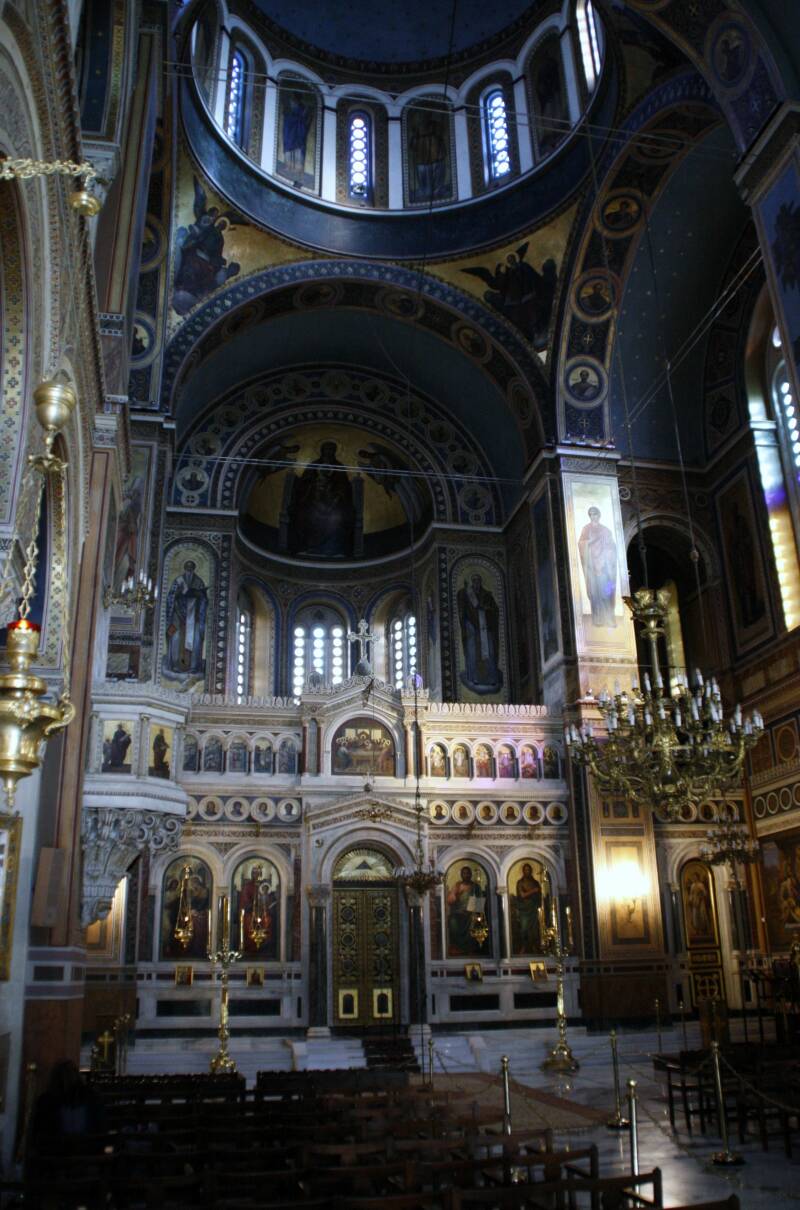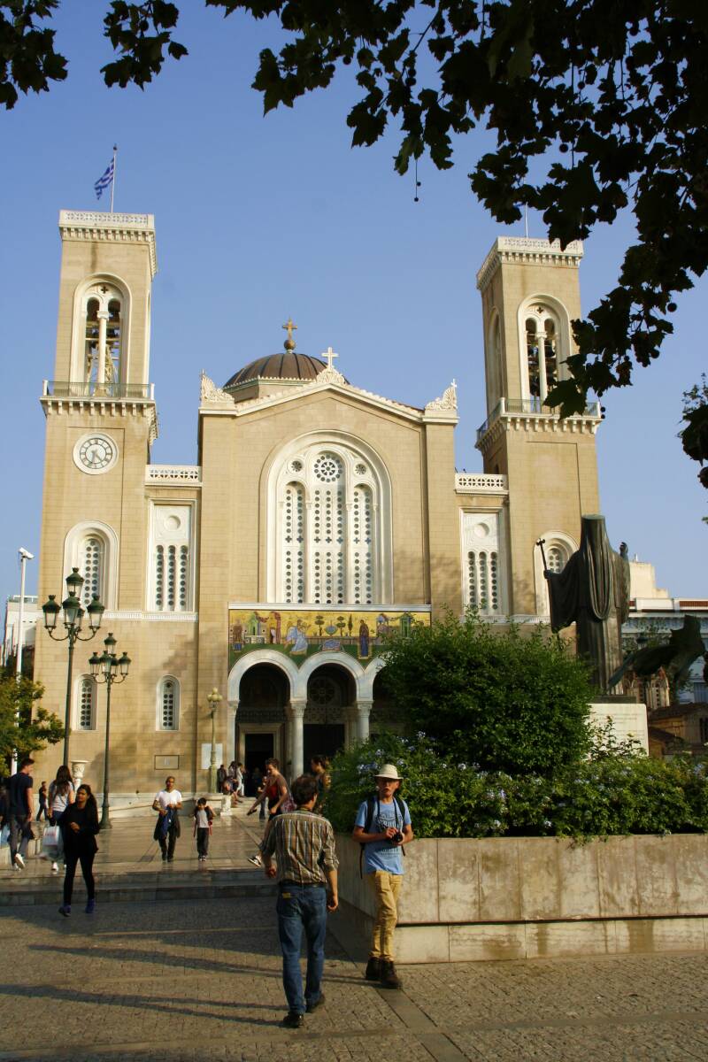 D e Metropolis Kathedraal is de grootste kerk van Athene en de zetel van de bisschop. Er hebben maar liefst drie architecten aan gewerkt (Franz Boulanger, Theophil Hansen en Dimítrios Zézos) en dat verklaart wellicht de nogal plompe bouw. De eerste steen werd gelegd in 1842, twintig jaar later was de kerk voltooid. Voor de bouw werd marmer gebruikt afkomstig van meer dan 70 gesloopte Byzantijnse kerken.