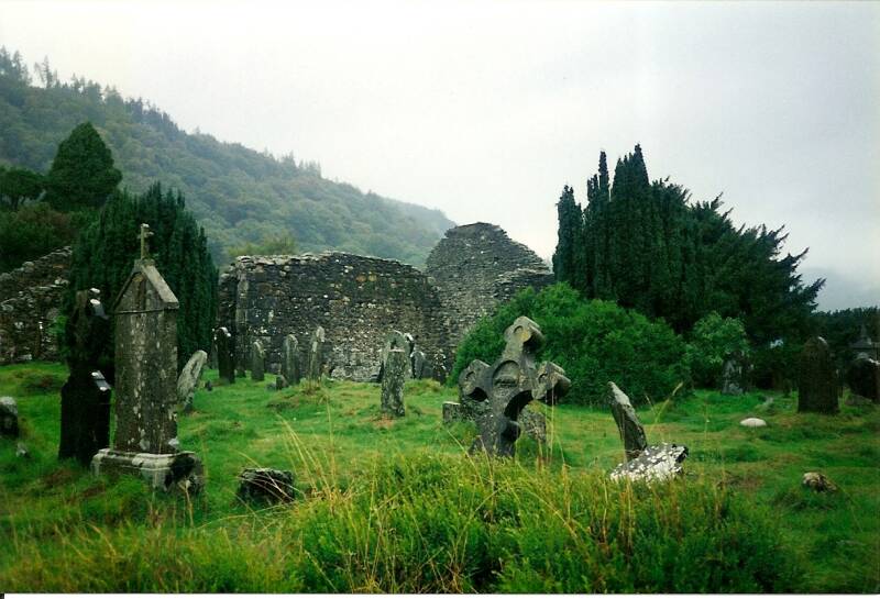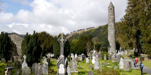 Als je in Dublin bent, moet je niet alleen van de stad genieten, maar ook van de omgeving van de stad. Vandaar dat we een bustocht hadden besproken om de schitterende omgeving te bewonderen. Onze bustocht ging via Glendalough. Glendalough is een Ierse vallei in het Nationaal Park Wicklow Mountains, ongeveer 40 kilometer ten zuiden van Dublin. De naam van een klooster gesticht door St. Kevin, waarvan de overblijfselen behoren tot de oudste christelijke overblijfselen van Europa. De naam Glendalough is afgeleid uit het Iers: Gleann Dá Locha: "Dal van de twee meren", refererende aan de meren in het dal genaamd Lower Lough en Upper Lough. Je ziet hier een prachtig natuurgebied, met watervallen en snelstromende rivieren.
