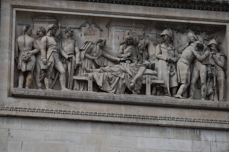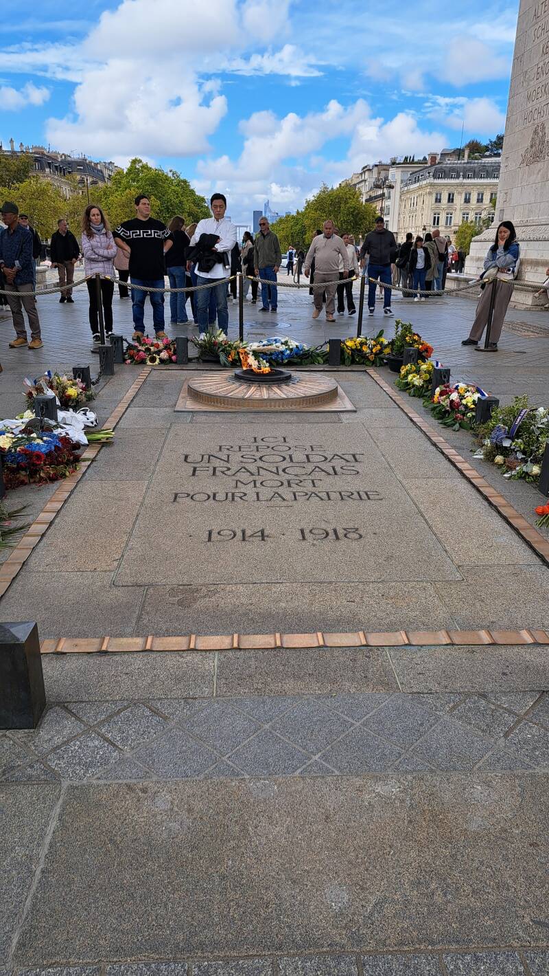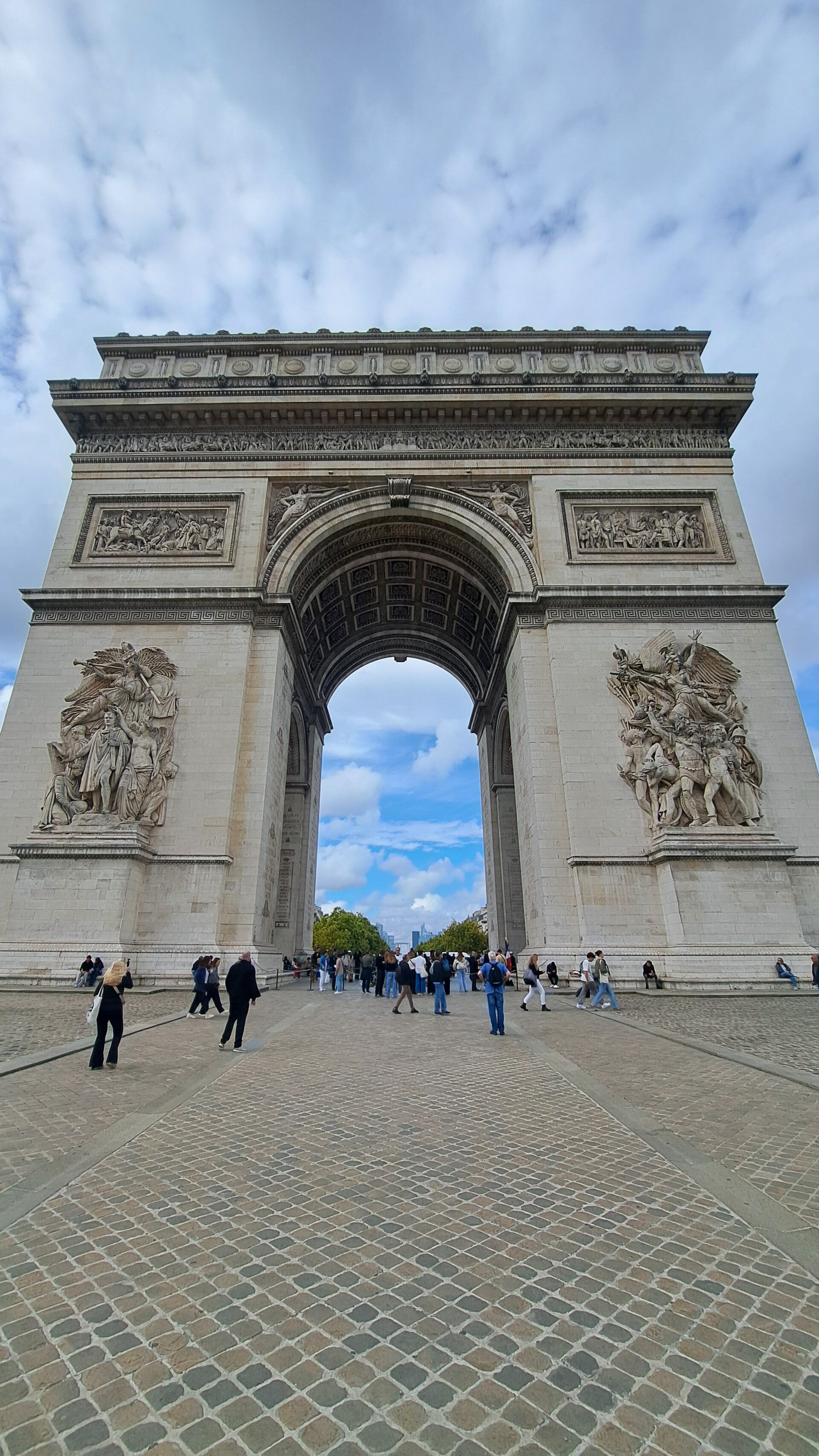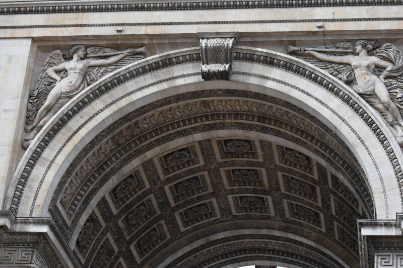 Vanop de Champs-Élysées is het onbegonnen werk om de drukke rotonde over te steken, maar gelukkig is er een ondergronds gangpad dat je zonder kleerscheuren naar de triomfboog brengt. Als je vlakbij het monument staat, merk je pas echt hoe groots dit bouwwerk eigenlijk is.