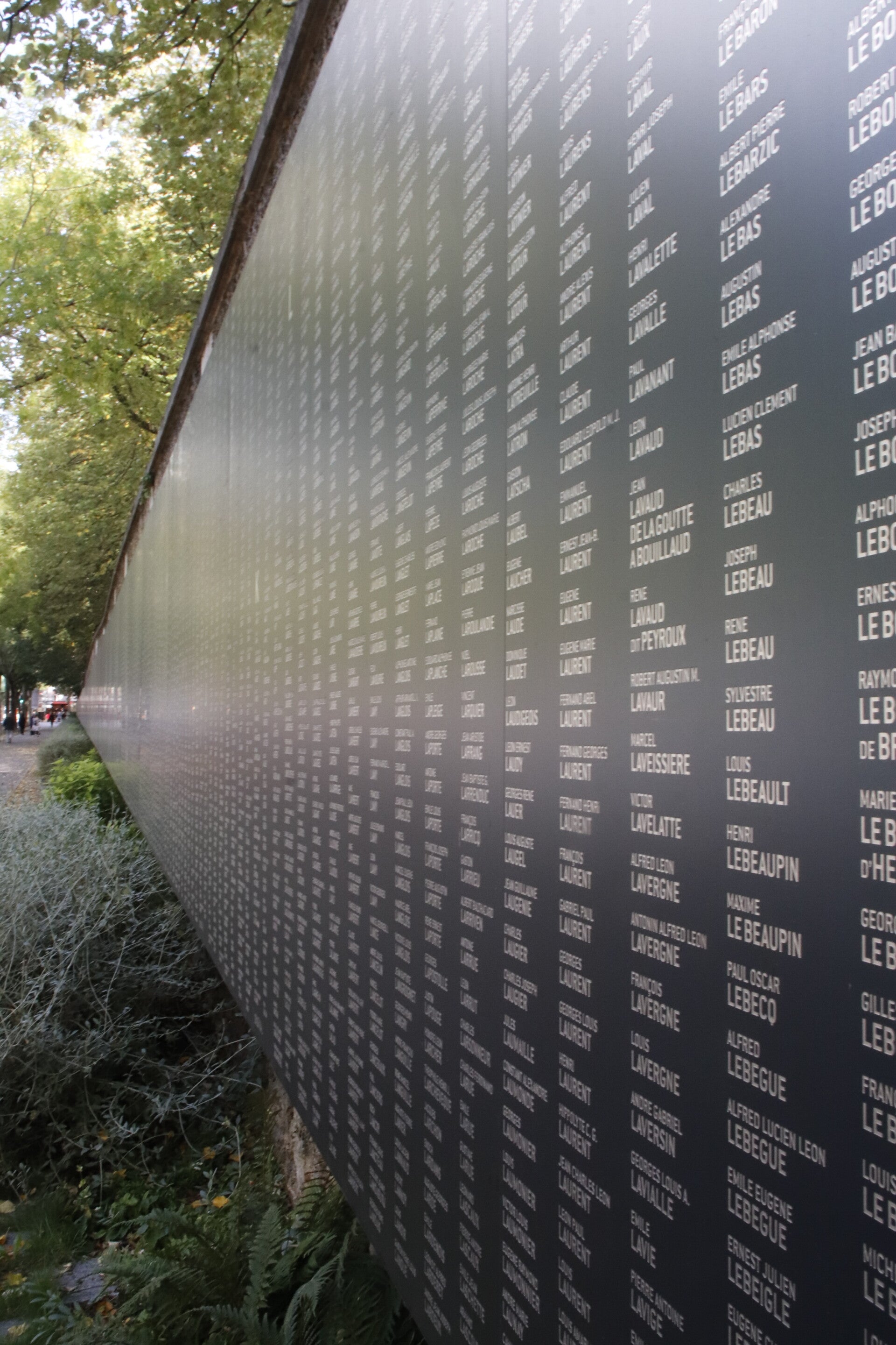 De muur werd in 2018 ingehuldigd, honderd jaar na de wapenstilstand. In sobere letters zijn de namen gegraveerd, alfabetisch gerangschikt, zodat elke voorbijganger de kans heeft om te zoeken, te vinden, of gewoon stil te staan. Het monument vertelt geen verhalen met beelden of symbolen, maar met de kracht van herinnering zelf: naam na naam, mens na mens, leven na leven.